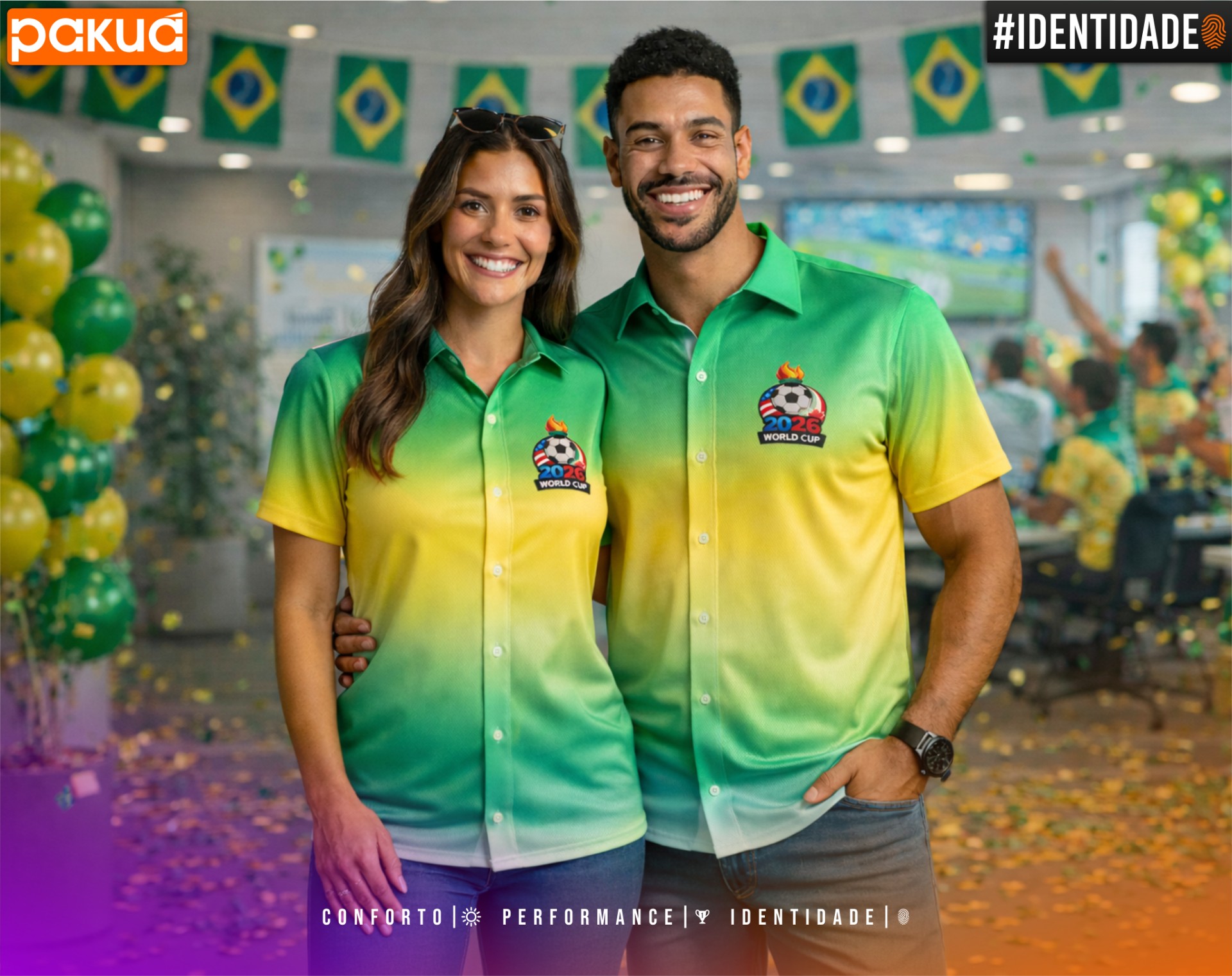 A Pakuá desenvolve a Camisa Resort Copa 2026 com foco em personalização corporativa: logomarca, assinatura de campanha, hashtag, frases internas, variações por unidade, naming de times/áreas e composição de identidade visual. A peça permite construir uma narrativa: não é só vestir a Copa — é vestir a cultura da empresa naquele momento.